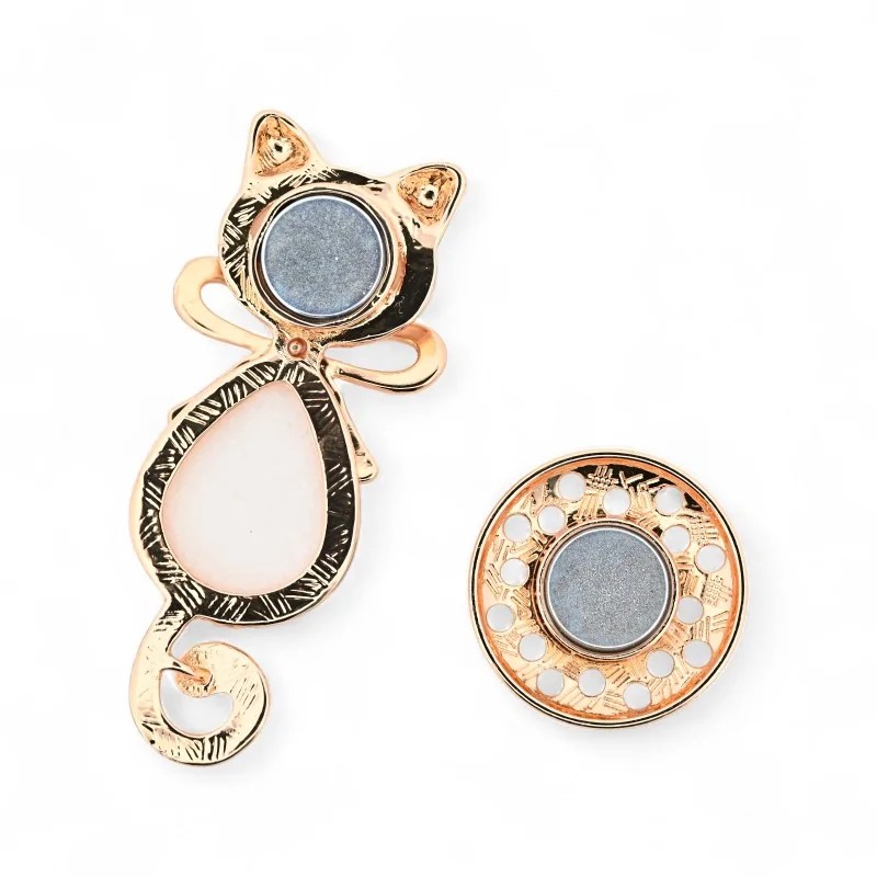 Cette charmante broche aimantée chat combine l'élégance du style kawaii japonais avec des finitions dorées raffinées. La silhouette gracieuse du chat assis avec sa queue enroulée capture parfaitement l'essence féline dans un design romantique et mignon. La pierre naturelle effet marbré rose poudré sublimée par les finitions rose gold brillantes crée un bijou unique qui s'adapte à toutes vos tenues. Le système aimanté révolutionnaire permet de porter cette broche sur tous types de vêtements sans risquer de les endommager, contrairement aux épingles traditionnelles.