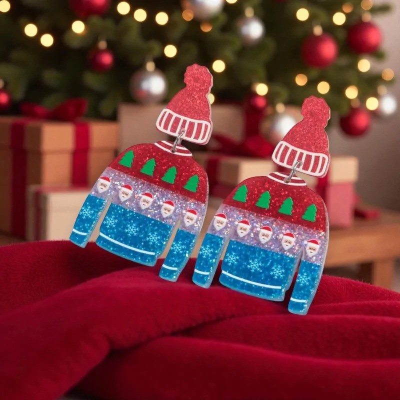 Illuminez vos fêtes avec ces adorables boucles d'oreilles fantaisie représentant un pull de Noël coloré surmonté d'un bonnet festif. Réalisées en résine légère, elles affichent des motifs joyeux incluant sapins verts, Père Noël souriants et flocons de neige sur fond bleu et rouge. Mesurant 5.5x3.5cm, ces bijoux originaux transforment instantanément votre look en tenue festive parfaite pour toutes les célébrations de fin d'année.
