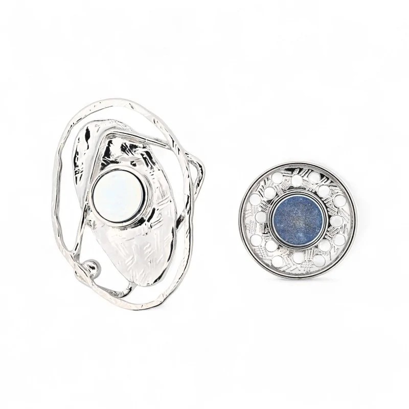Cette broche aimantée transcende les codes du bijou traditionnel pour devenir une véritable sculpture portable. Son design contemporain audacieux s'inspire des œuvres de Calder et de l'art abstrait pour créer un bijou artistique unique. La pièce centrale, une grande pierre ovale aux couleurs aquarelle fondues, dialogue harmonieusement avec trois pierres facettées éclatantes et des lignes argentées fluides. Chaque pièce présente un effet marbré naturel différent, garantissant l'exclusivité de votre bijou. Les teintes violet lavande, orange pêche, vert olive, rose fuchsia, bleu marine et beige nude se mêlent dans un dégradé poétique rappelant une peinture abstraite contemporaine. Cette création exceptionnelle puise son inspiration dans l'univers de la sculpture moderne et de l'aquarelle contemporaine.