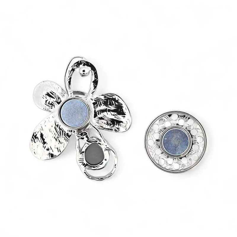 Découvrez cette extraordinaire broche fleur abstraite qui révolutionne l'art du bijou contemporain. Son design sculptural sophistiqué mêle six pétales aux textures contrastées : pierre facettée fumée, métal martelé ajouré, nacré lisse avec strass, anneau métallique minimaliste, pierre marbrée effet agate et goutte argentée brillante. Cette broche aimantée design offre une palette raffinée de gris fumé et d'argenté métallisé pour un rendu artistique moderne exceptionnel.