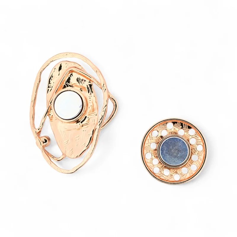 Cette broche aimantée représente l'excellence de la bijouterie contemporaine avec son design sculptural audacieux. La pièce centrale arbore une pierre naturelle marbrée unique aux nuances beige taupe, sublimée par des lignes métalliques fluides en finition rose gold. Chaque pierre centrale présente des veines délicates naturelles qui rendent chaque bijou absolument unique. Les pierres facettées champagne dorées captent magnifiquement la lumière, créant un jeu de reflets sophistiqué. Cette création marie l'authenticité minérale brute avec l'élégance du métal poli, offrant un contraste saisissant qui attire tous les regards.